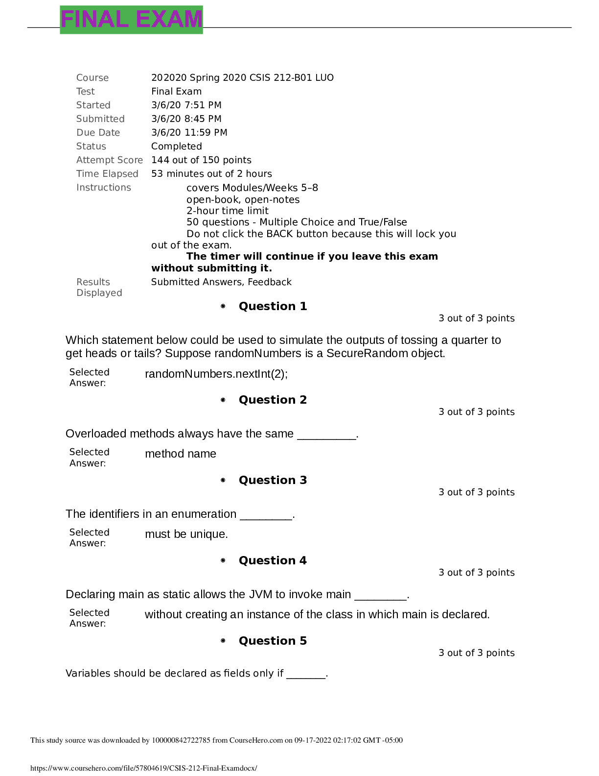 Programming > EXAM > CSIS 212 Final Exam ALL ANSWERS 100% CORRECT AID GRADE A+ (All)