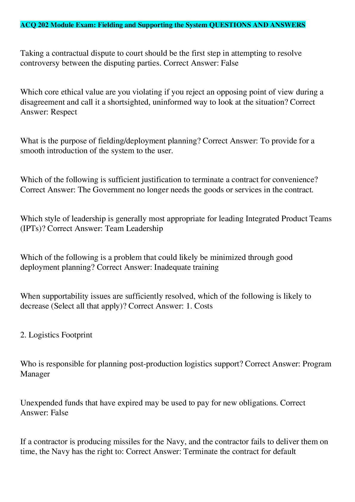 Programming > QUESTIONS & ANSWERS > ACQ 202 Module Exam: Fielding and Supporting the System QUESTIONS AND ANSWERS (All)
