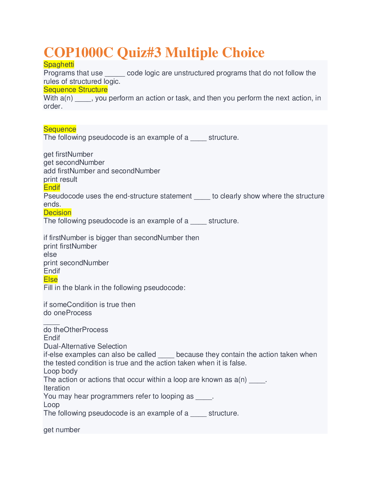 Programming > EXAM > COP1000C Quiz#3 Multiple Choice with Answers Upfront (All)
