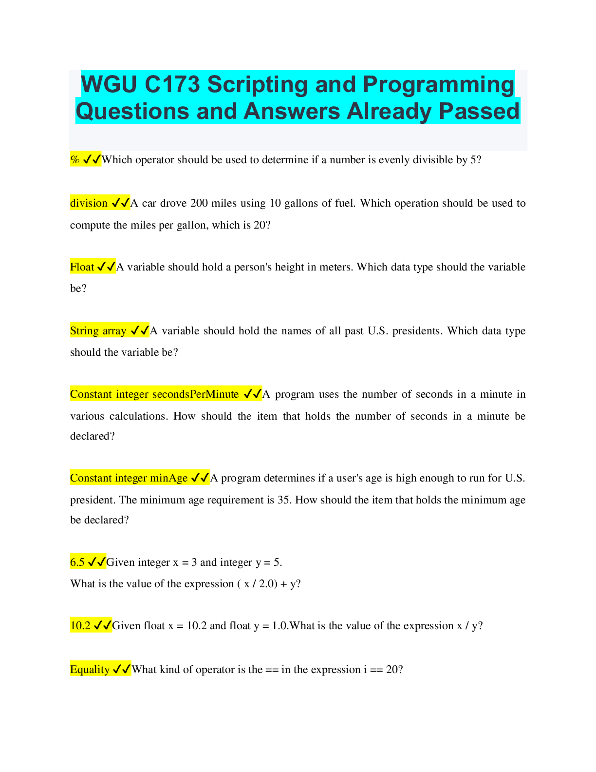 Programming > QUESTIONS & ANSWERS > WGU C173 Scripting and Programming Questions and Answers Already Passed (All)
