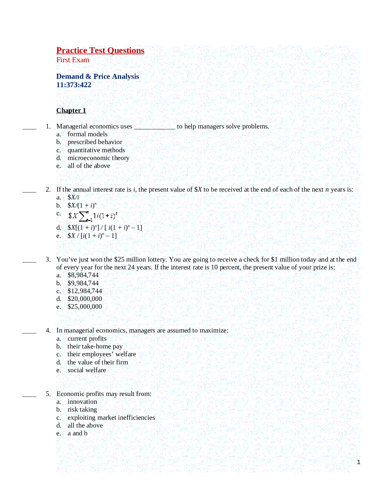 Microeconomics > EXAM > Rutgers University 373 421 Demand Price Analysis: First Exam Practice Questions Demand & Price Analysis. Chapter 1-4 (All)
