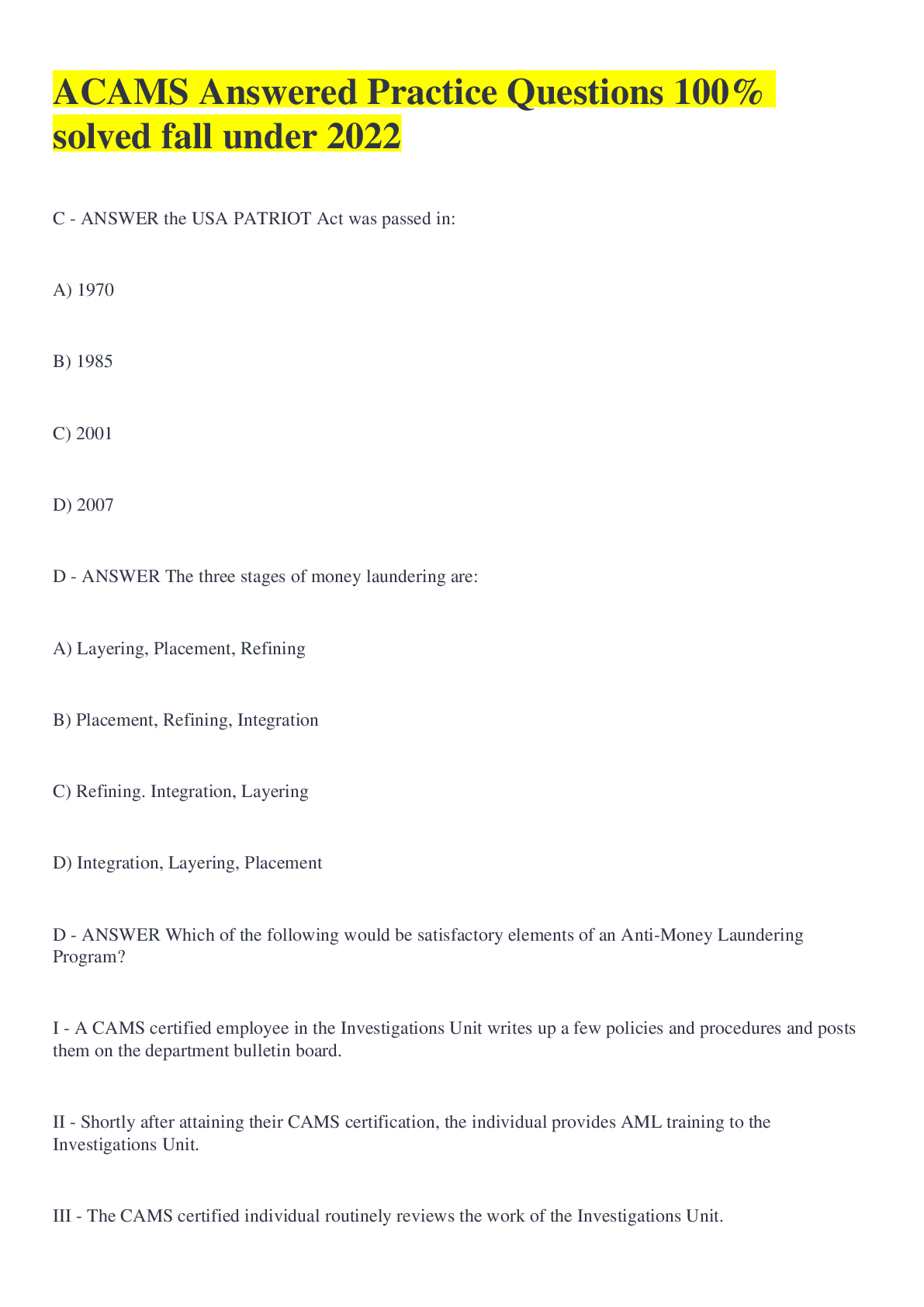 Social Sciences > EXAM > ACAMS Answered Practice Questions 100% solved fall under 2022 (All)