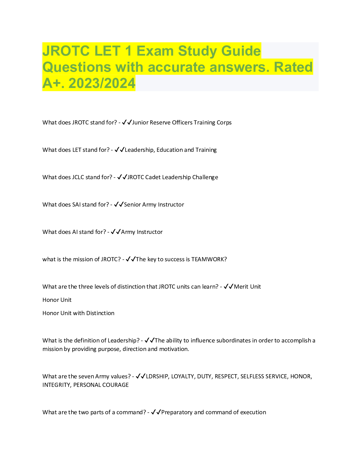 Social Sciences > QUESTIONS & ANSWERS > JROTC LET 1 Exam Study Guide Questions with accurate answers. Rated A+. 2023/2024 (All)
