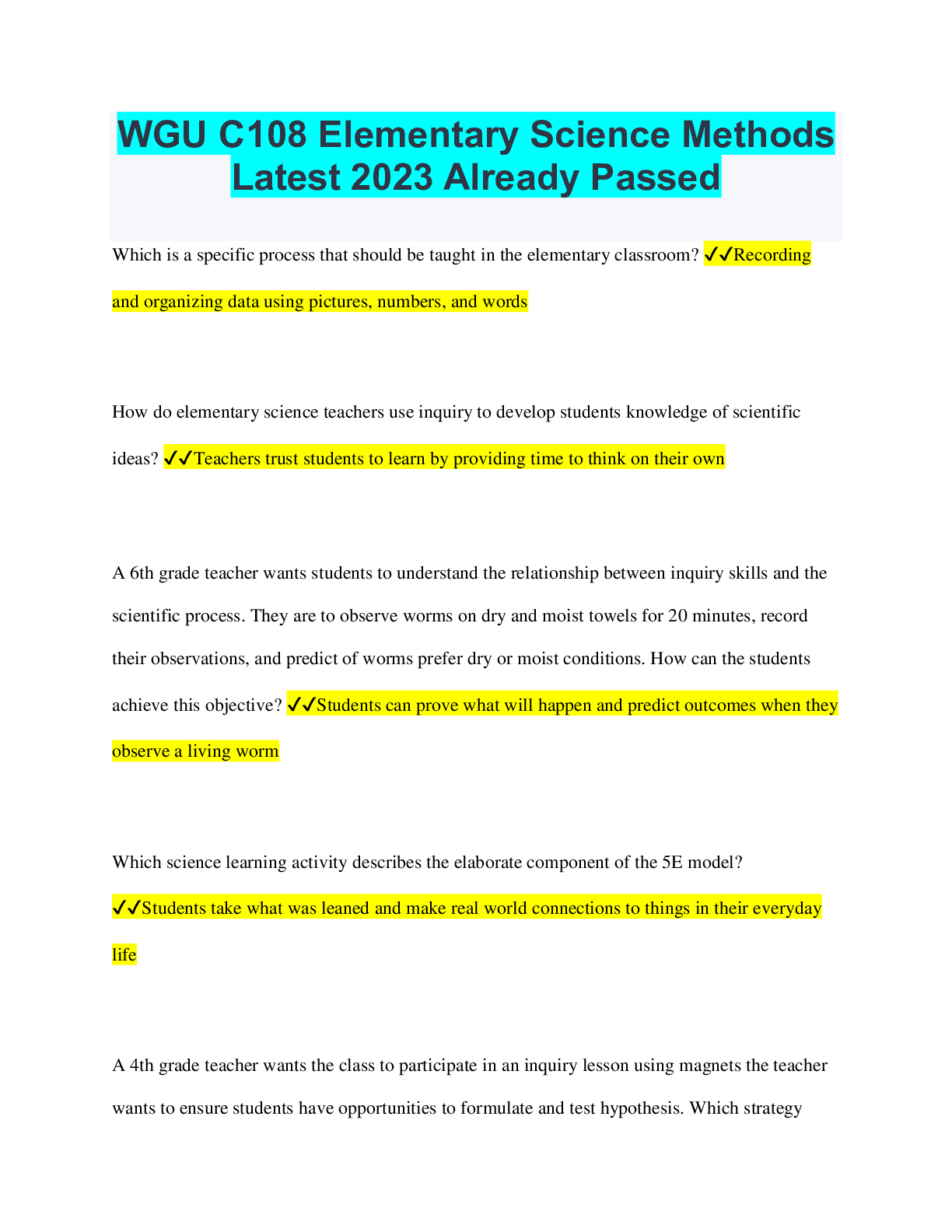 Social Sciences > QUESTIONS & ANSWERS > WGU C108 Elementary Science Methods Latest 2023 Already Passed (All)