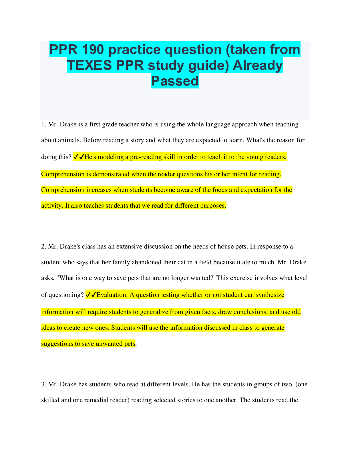 Social Sciences > QUESTIONS & ANSWERS > PPR 190 practice question (taken from TEXES PPR study guide) Already Passed (All)