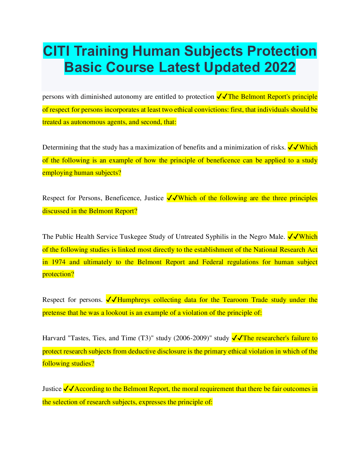 Social Sciences > EXAM > CITI Training Human Subjects Protection Basic Course Latest Updated 2022 (All)