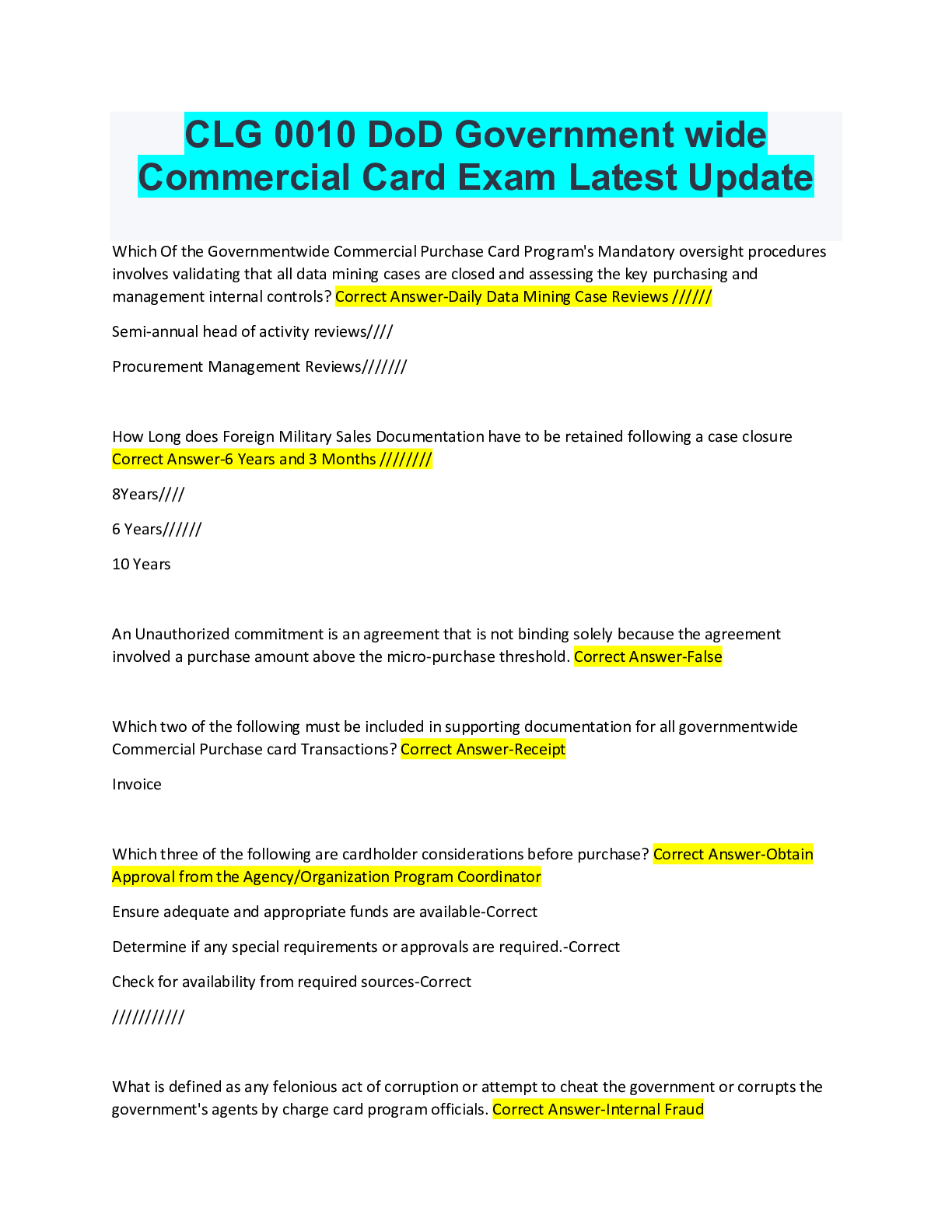 Social Sciences > EXAM > CLG 0010 DoD Government wide Commercial Card Exam Latest Update (All)