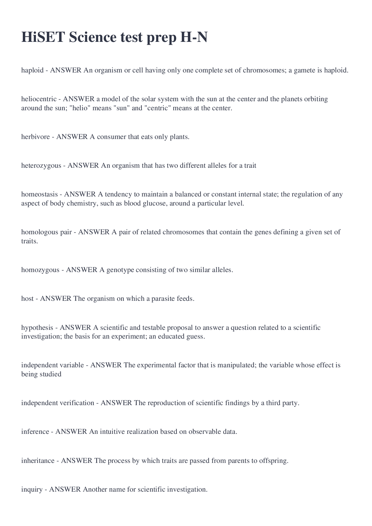 Social Sciences > EXAM > HiSET Science test prep H-N with complete ANSWERS (All)