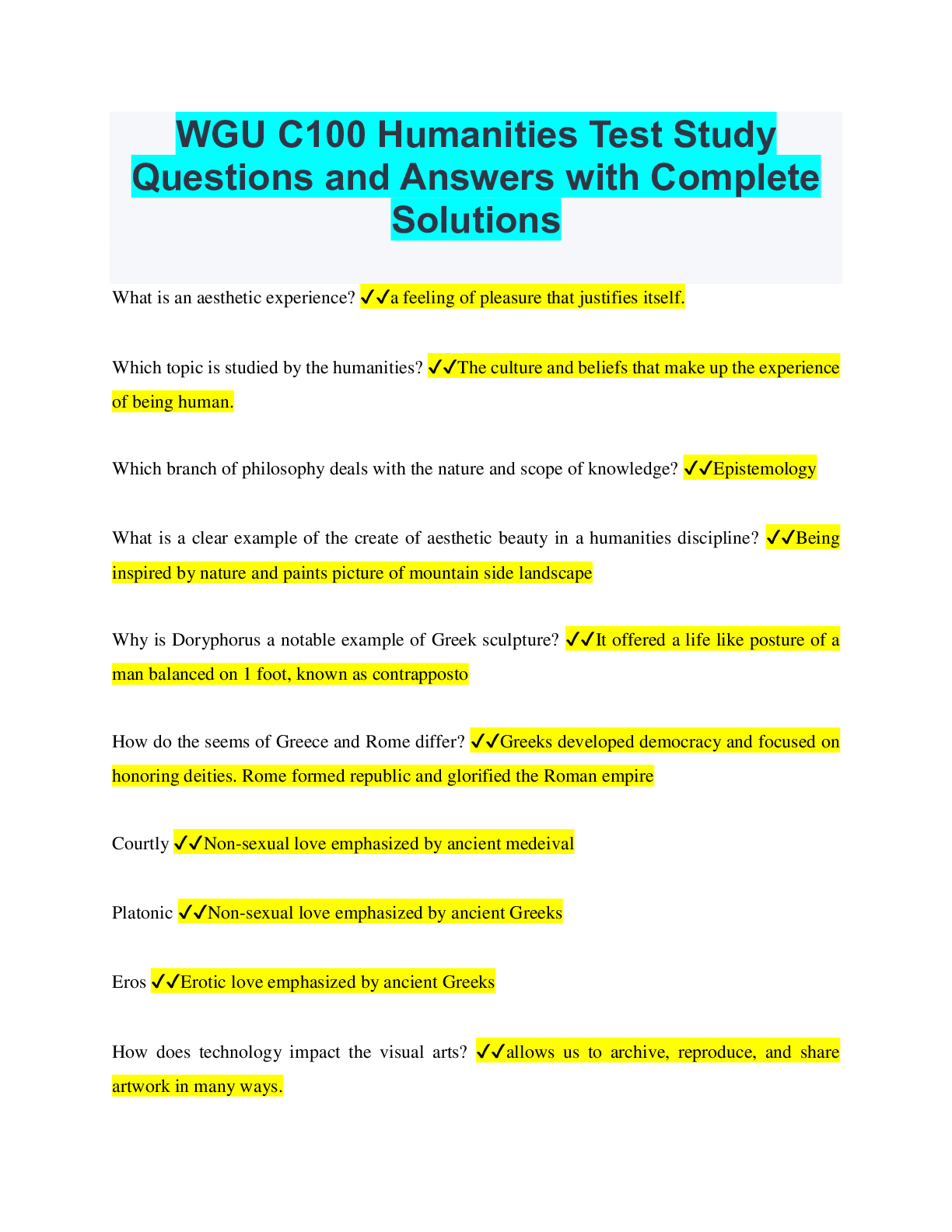 Social Sciences > EXAM > WGU C100 Humanities Test Study Questions and Answers with Complete Solutions (All)