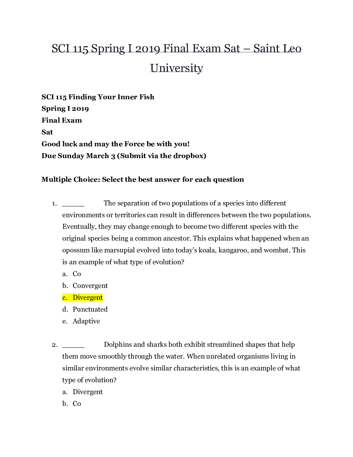 Social Sciences > EXAM > SCI 115 Spring I 2019 Final Exam Sat – Saint Leo University | SCI 115 Finding Your Inner Fish (All)