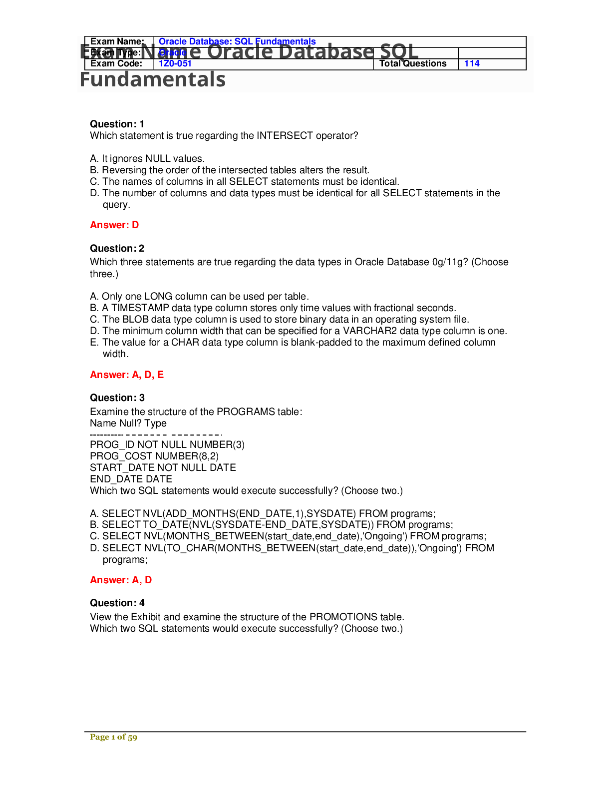 Social Sciences > EXAM > Oracle Database SQL Fundamentals 1z0-051 Exam (All)