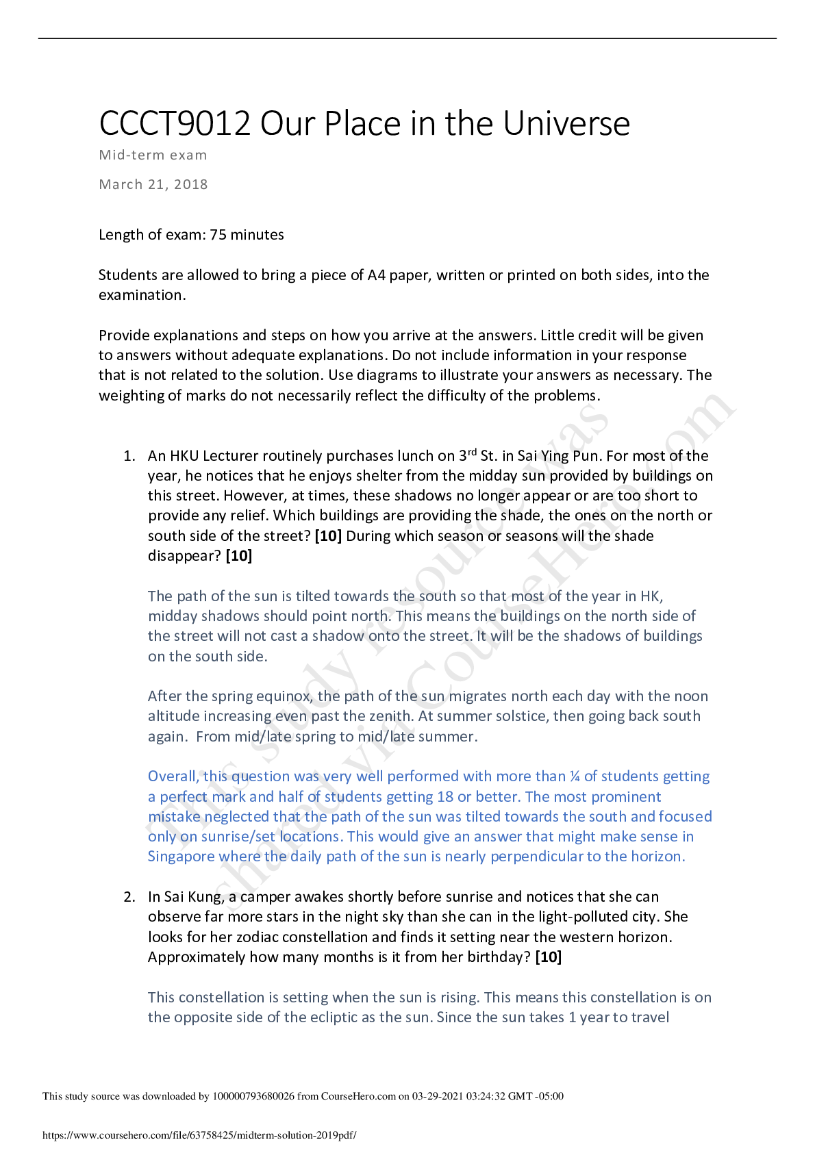 Social Sciences > EXAM > CCCT9012 Our Place in the Universe The University of Hong Kong - CCST 9012midterm solution 2019 WITH COMPLETE DETAILED ANSWERS (All)