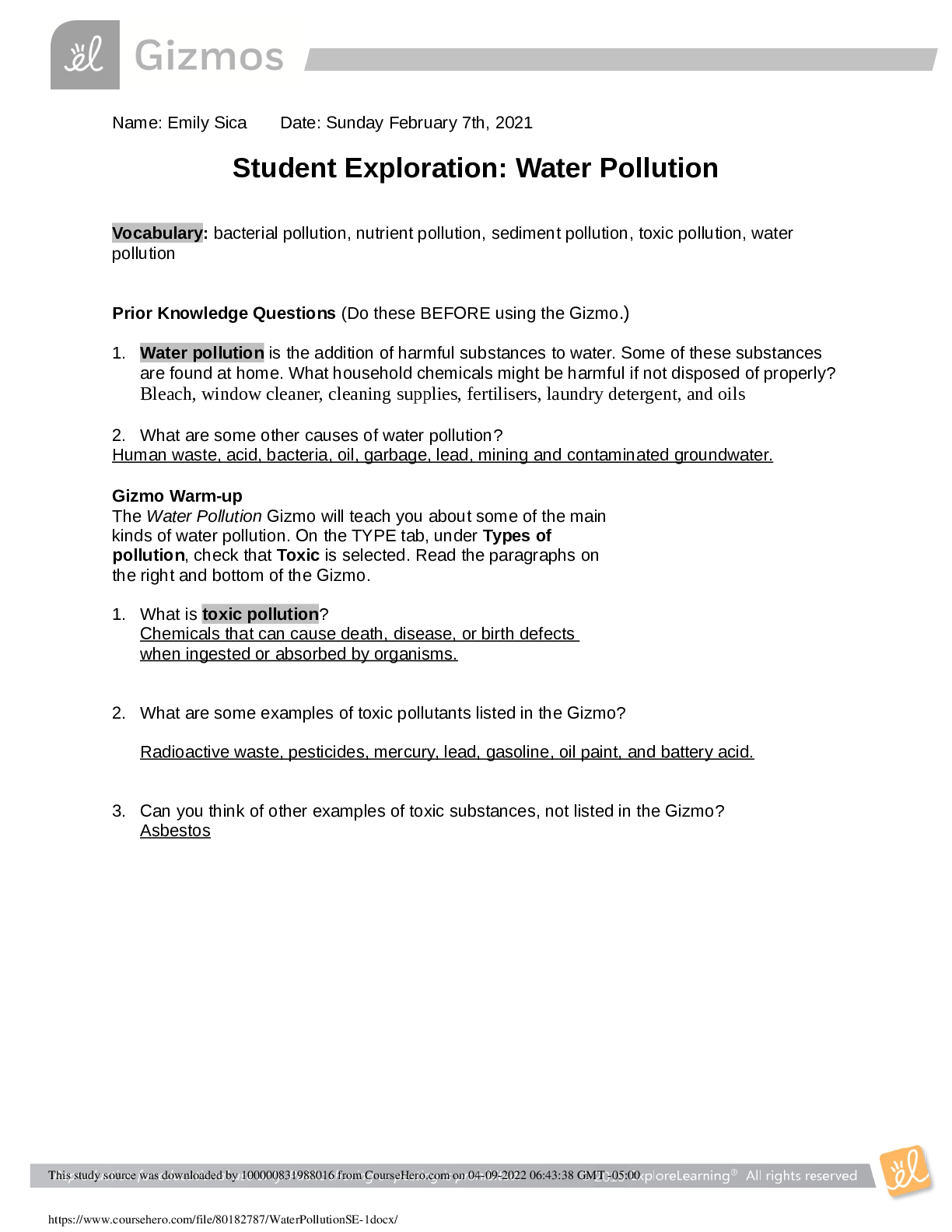 Social Sciences > GIZMOS > APES 110_Gizmo_Student Exploration: Water Pollution_2021 | APES 110_Gizmo Water Pollution (All)