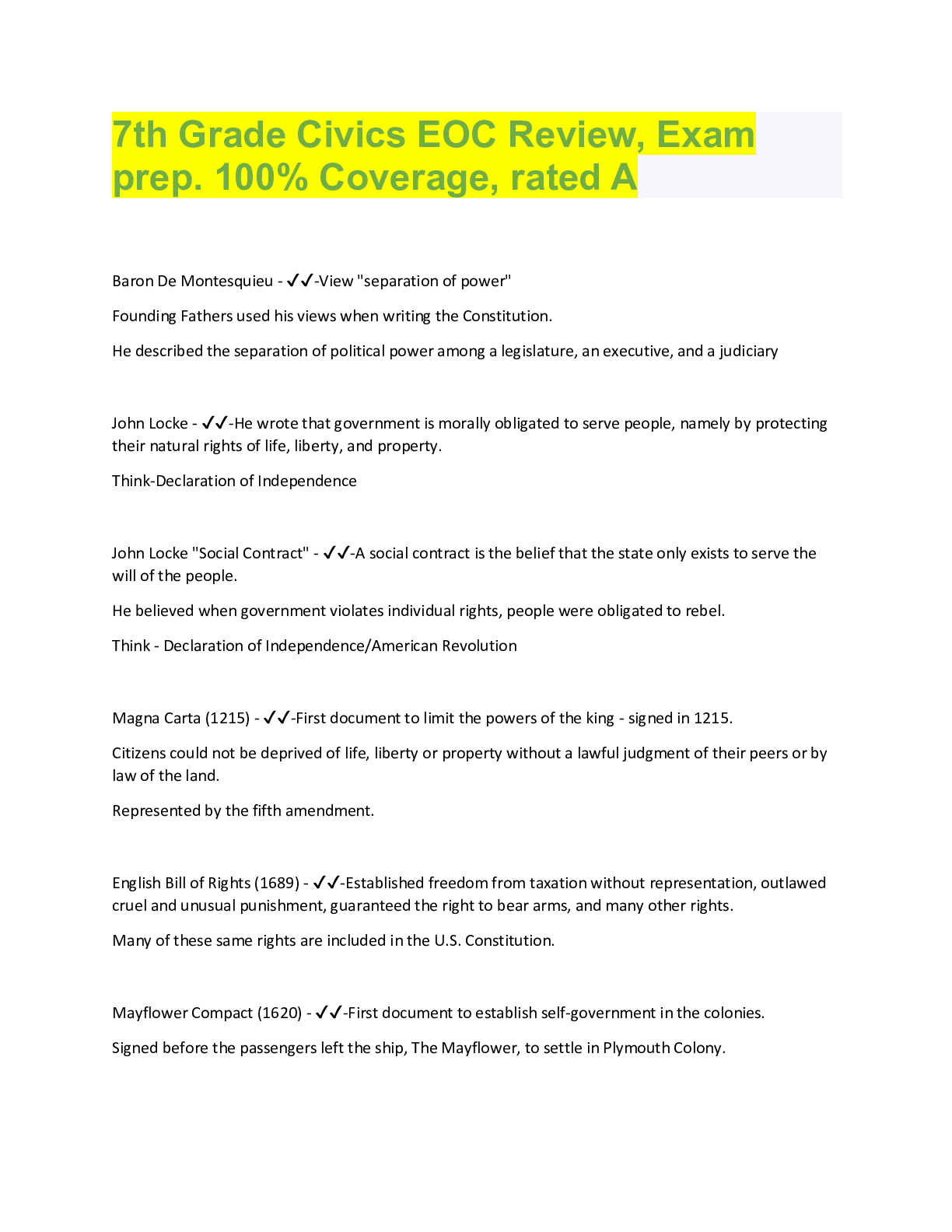 Social Sciences > QUESTIONS & ANSWERS > 7th Grade Civics EOC Review, Exam prep. 100% Coverage, rated A (All)