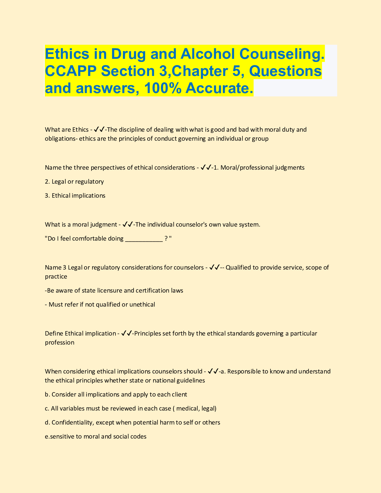 Social Sciences > QUESTIONS & ANSWERS > Ethics in Drug and Alcohol Counseling. CCAPP Section 3,Chapter 5, Questions and answers, 100% Accurate. (All)