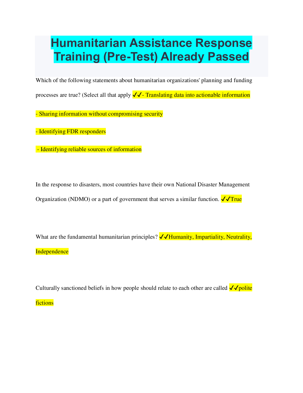Social Sciences > QUESTIONS & ANSWERS > Humanitarian Assistance Response Training (Pre-Test) Already Passed (All)