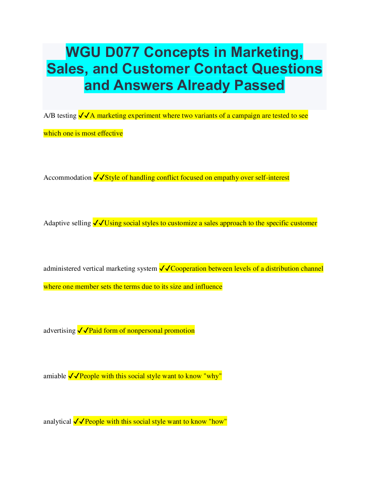 Social Sciences > QUESTIONS & ANSWERS > WGU D077 Concepts in Marketing, Sales, and Customer Contact Questions and Answers Already Passed (All)
