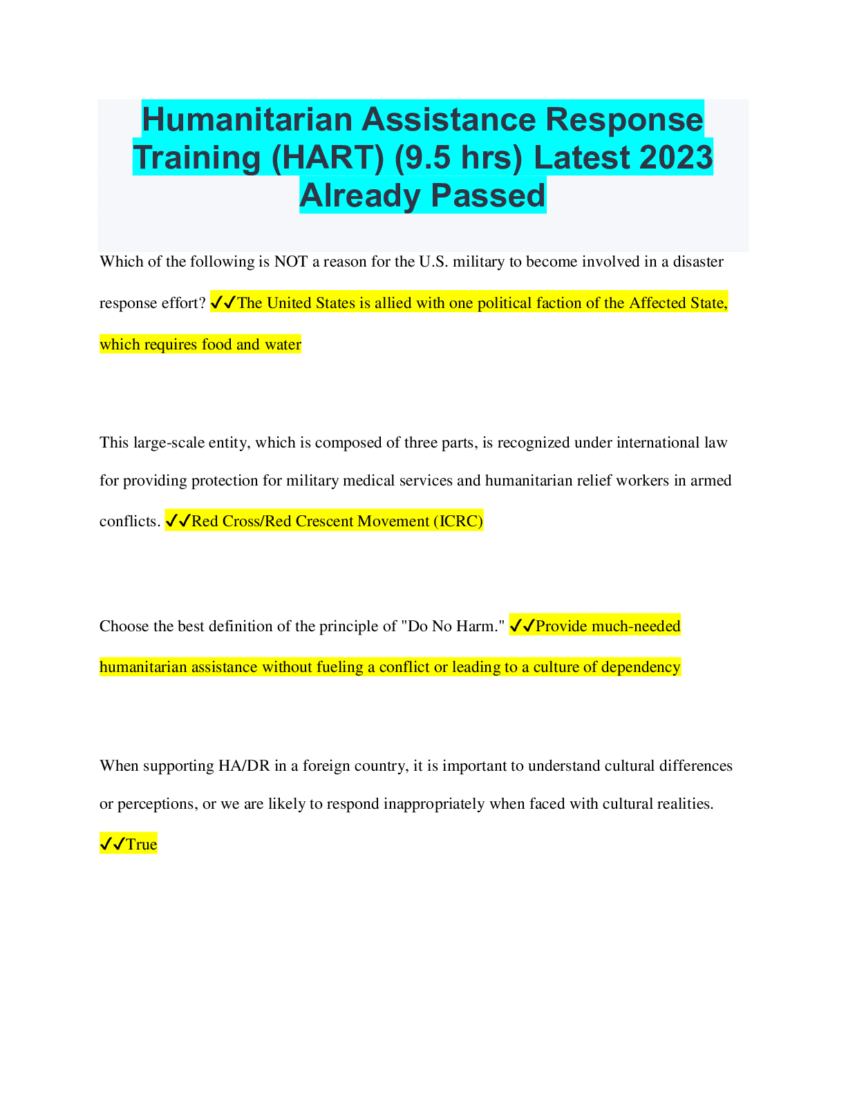 Social Sciences > QUESTIONS & ANSWERS > Humanitarian Assistance Response Training (HART) (9.5 hrs) Latest 2023 Already Passed (All)