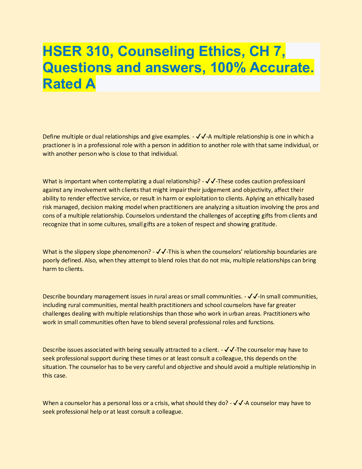 Social Sciences > QUESTIONS & ANSWERS > HSER 310, Counseling Ethics, CH 7, Questions and answers, 100% Accurate. Rated A (All)