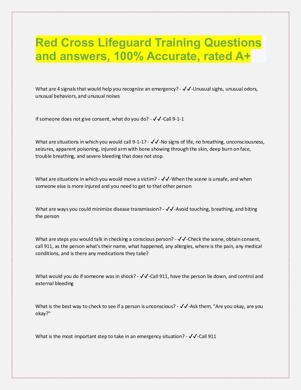 Social Sciences > QUESTIONS & ANSWERS > Red Cross Lifeguard Training Questions and answers, 100% Accurate, rated A+ What are 4 signals that would help you re (All)