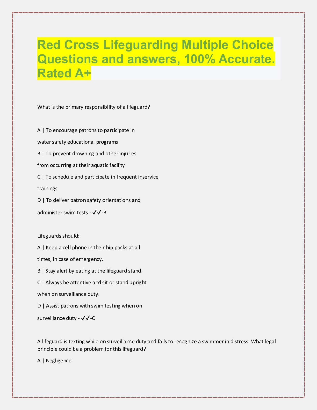 Social Sciences > QUESTIONS & ANSWERS > Red Cross Lifeguarding Multiple Choice Questions and answers, 100% Accurate. Rated A+ (All)