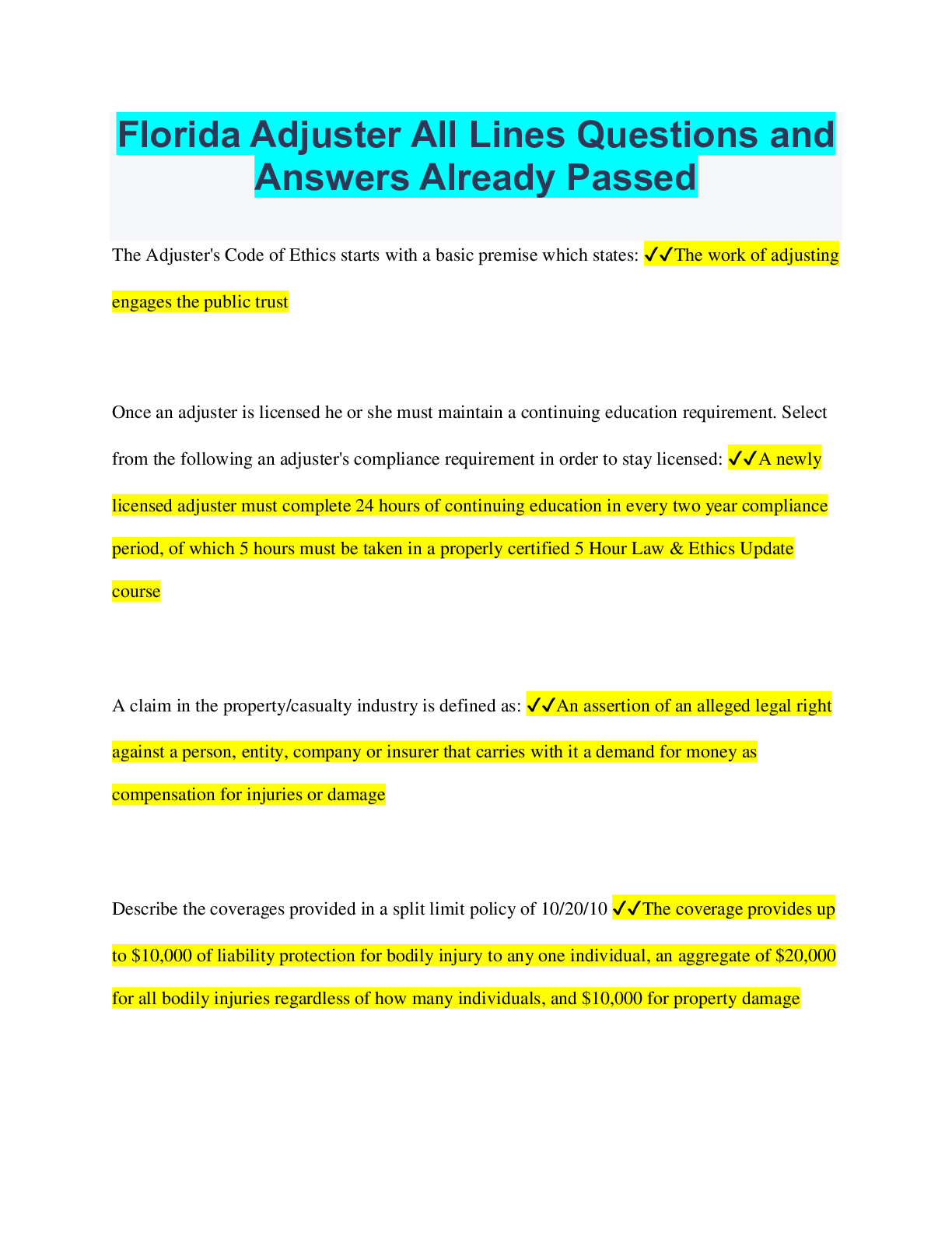 Social Sciences > QUESTIONS & ANSWERS > Florida Adjuster All Lines Questions and Answers Already Passed (All)