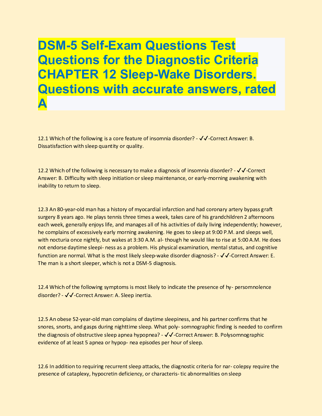 Social Sciences > QUESTIONS & ANSWERS > DSM-5 Self-Exam Questions Test Questions for the Diagnostic Criteria CHAPTER 12 Sleep-Wake Disorders. Questions with accurate answers, rated A (All)