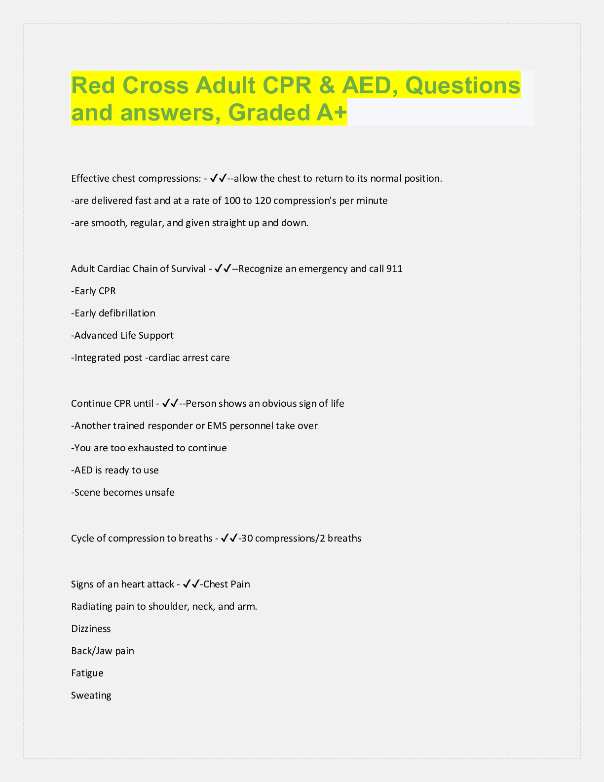 Social Sciences > QUESTIONS & ANSWERS > Red Cross Adult CPR & AED, Questions and answers, Graded A+ (All)