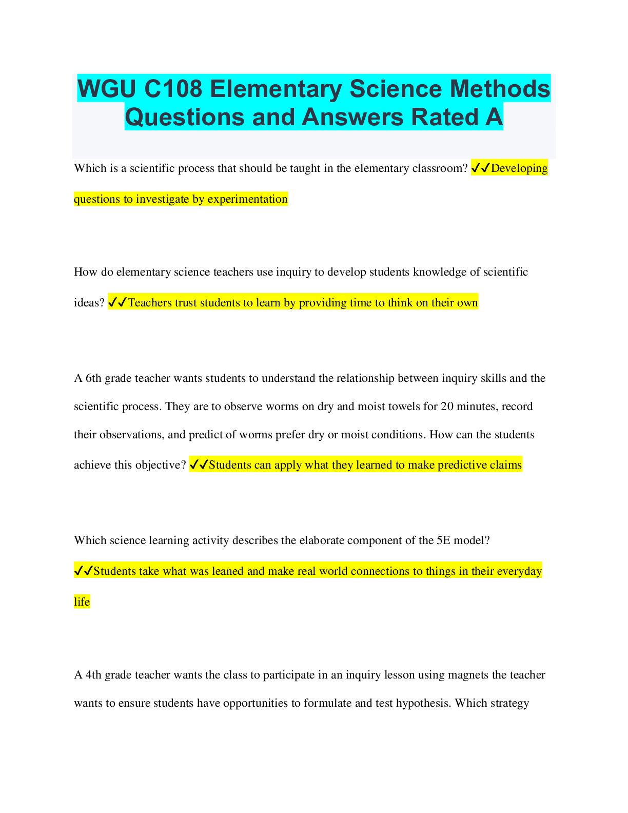 Social Sciences > QUESTIONS & ANSWERS > WGU C108 Elementary Science Methods Questions and Answers Rated A (All)