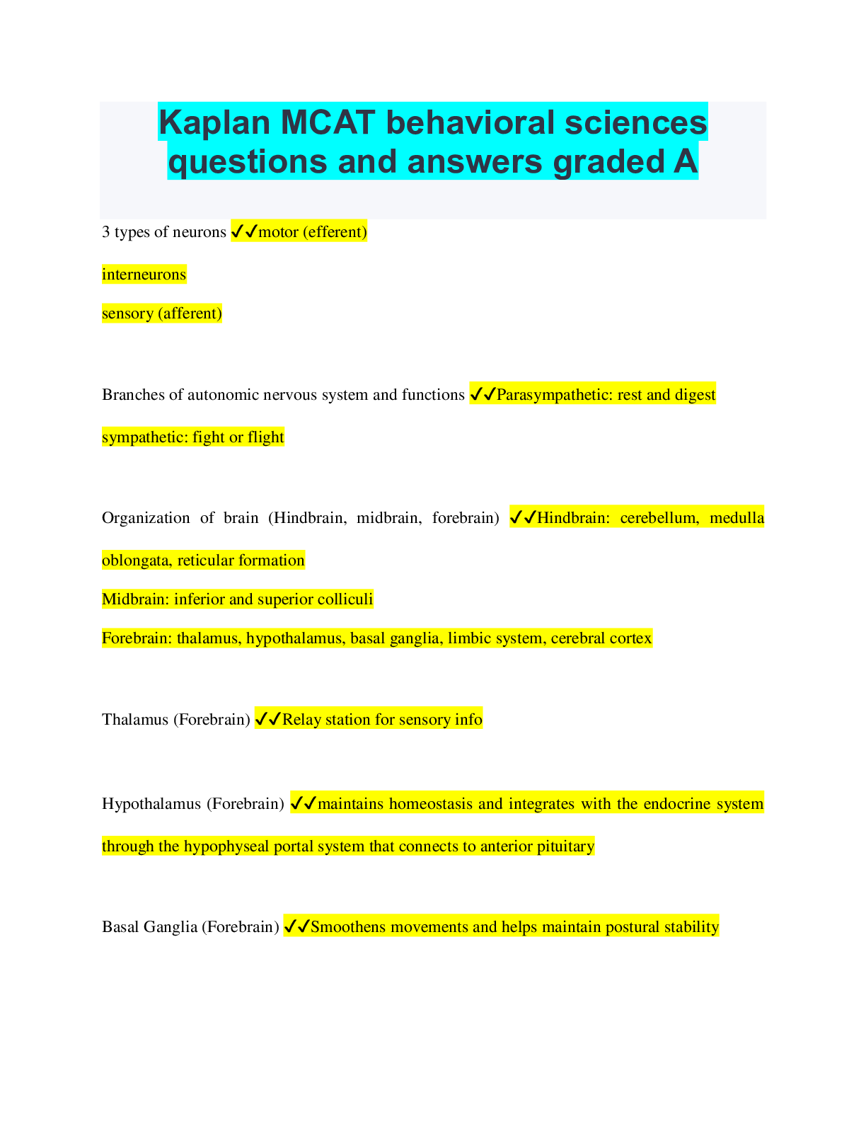Social Sciences > QUESTIONS & ANSWERS > Kaplan MCAT behavioral sciences questions and answers graded A (All)