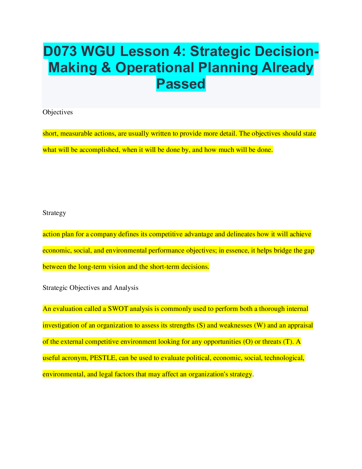 Social Sciences > QUESTIONS & ANSWERS > D073 WGU Lesson 4: Strategic DecisionMaking & Operational Planning Already Passed (All)
