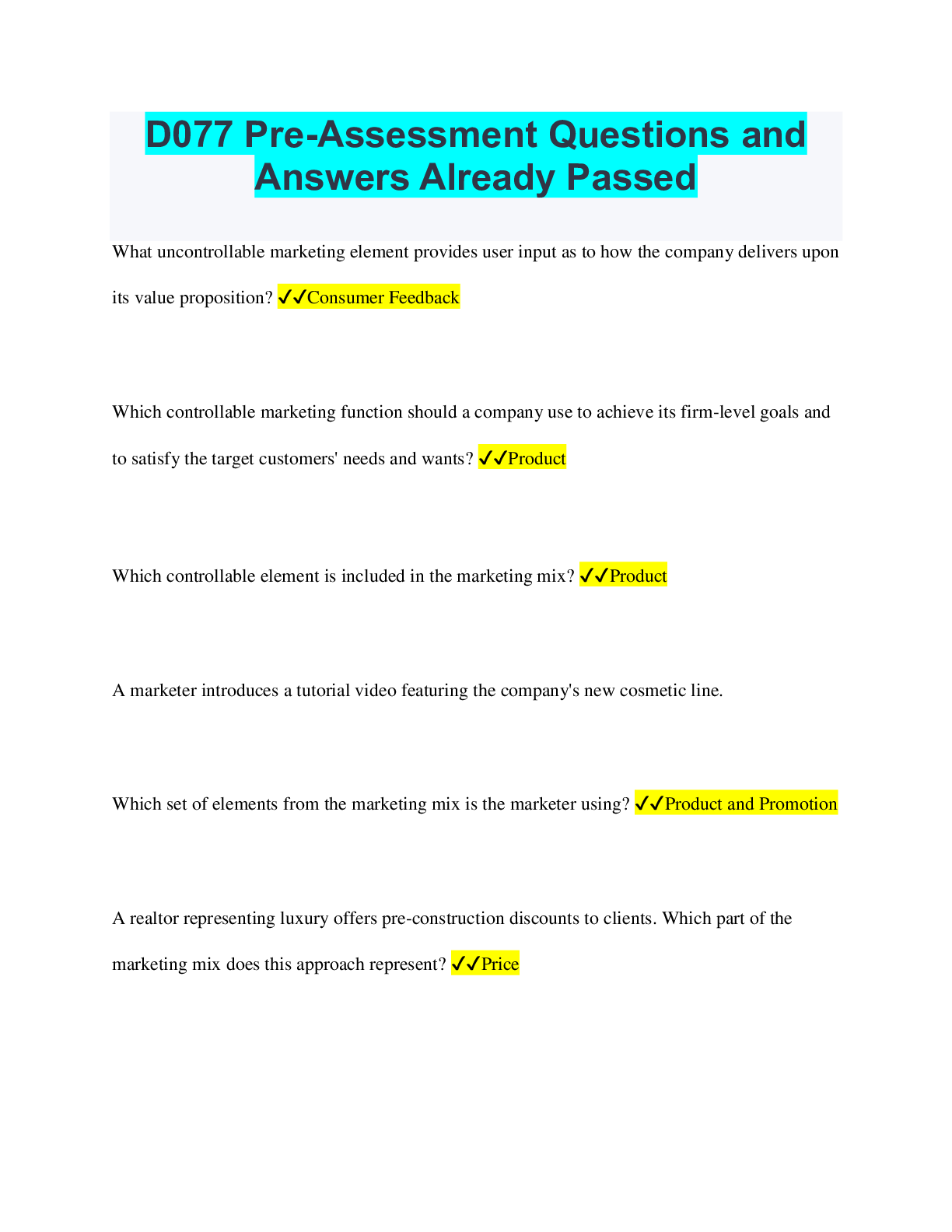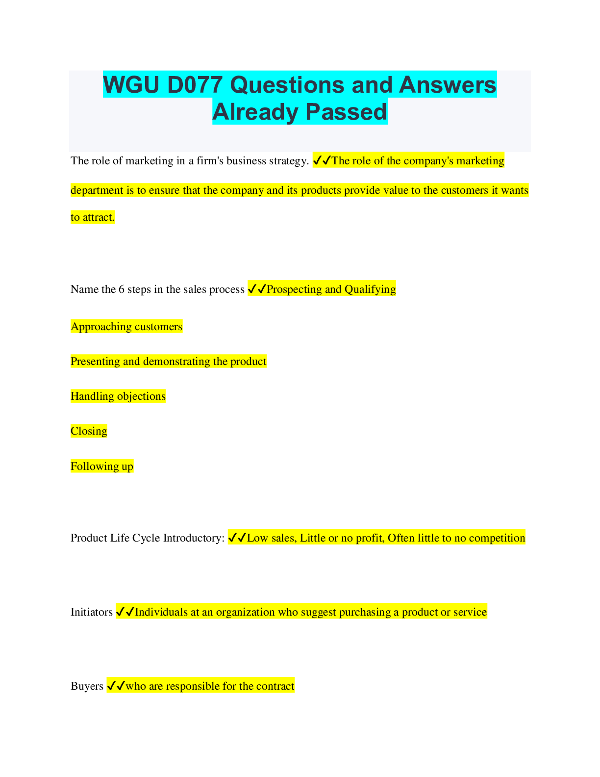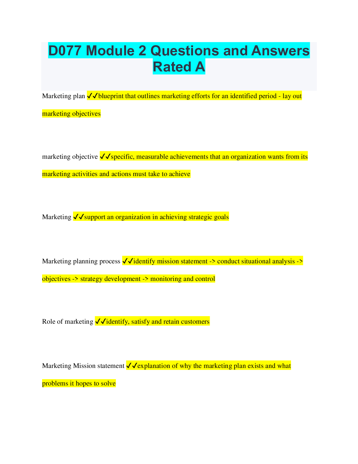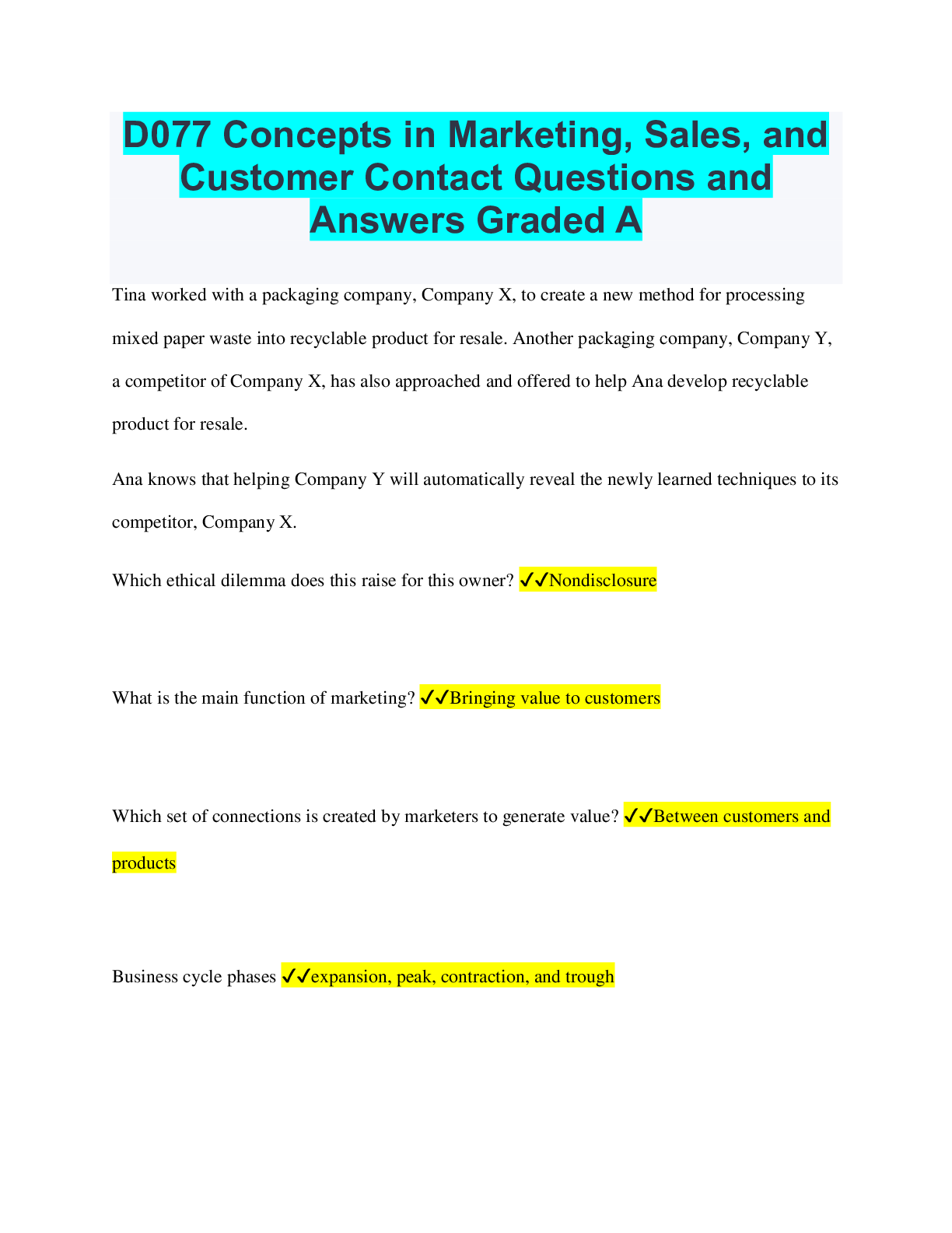 Social Sciences > QUESTIONS & ANSWERS > D077 Concepts in Marketing, Sales, and Customer Contact Questions and Answers Graded A (All)