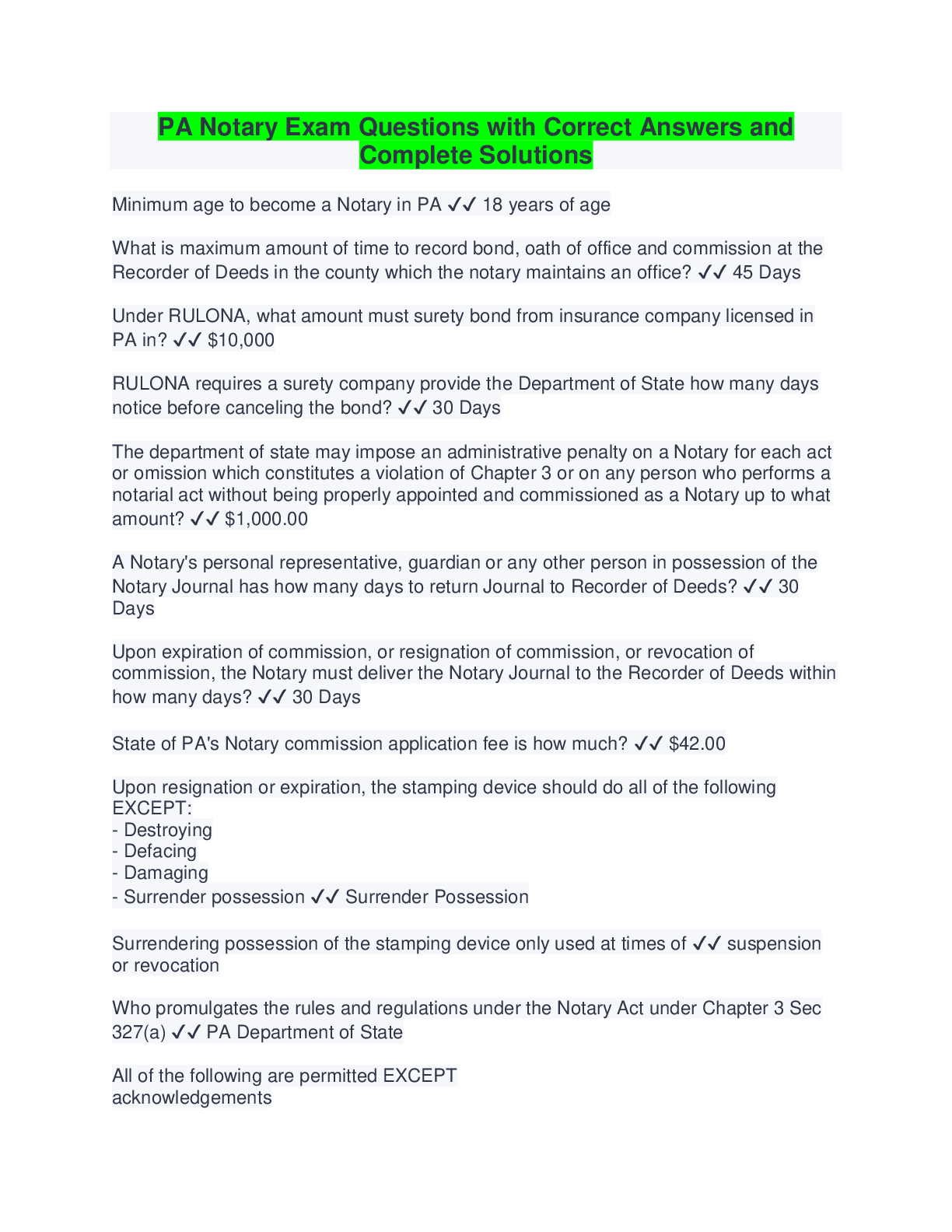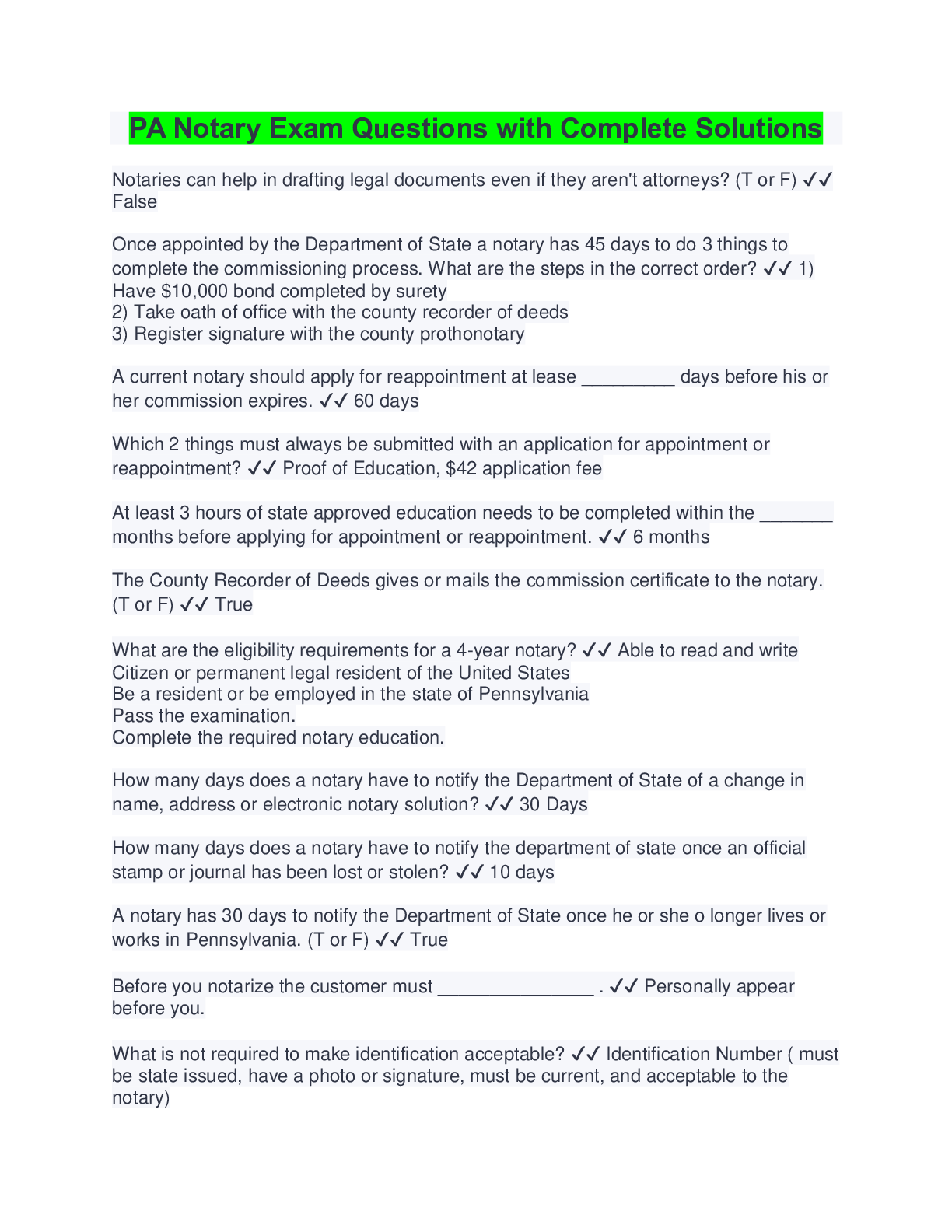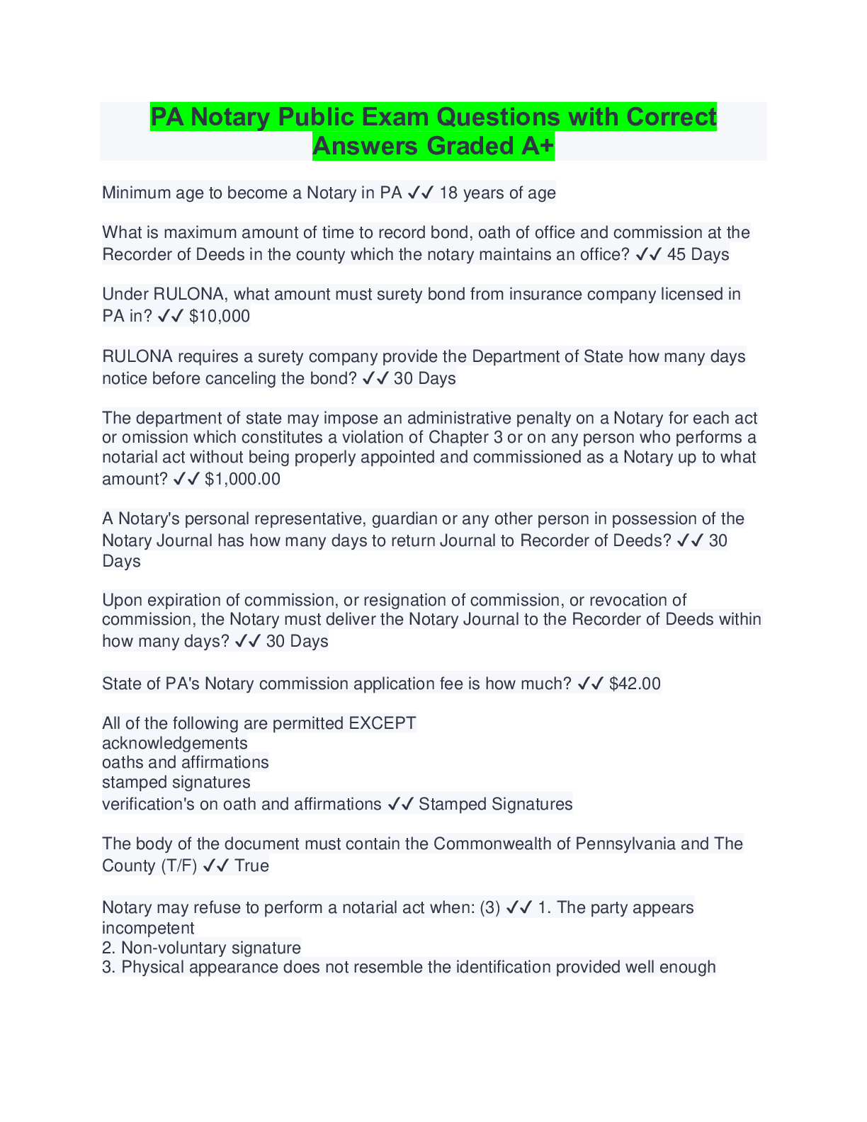 Social Sciences > QUESTIONS & ANSWERS > PA Notary Exam Questions with Correct Answers Latest Updates (All)