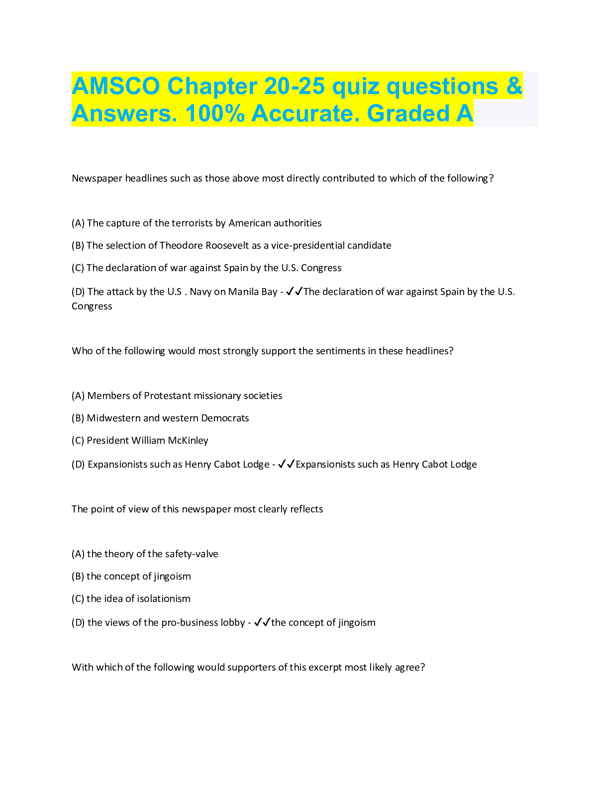 Social Sciences > QUESTIONS & ANSWERS > AMSCO Chapter 20-25 quiz questions & Answers. 100% Accurate. Graded A (All)