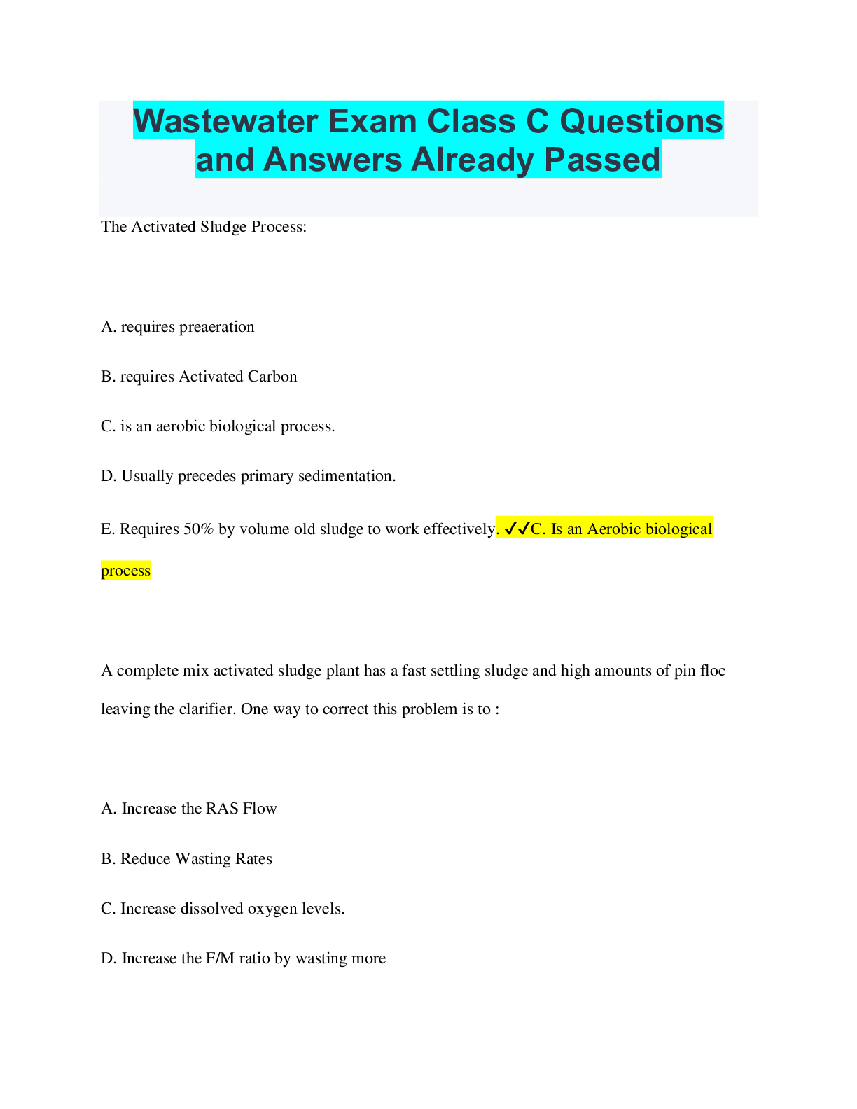 Social Sciences > QUESTIONS & ANSWERS > Wastewater Exam Class C Questions and Answers Already Passed (All)