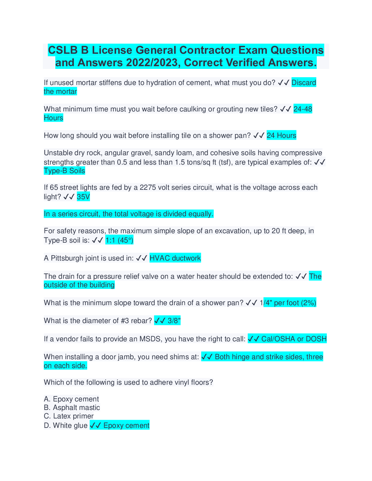 Electrical Engineering > QUESTIONS & ANSWERS > CSLB B License General Contractor Exam Questions and Answers 2022/2023, Correct Verified Answers. (All)