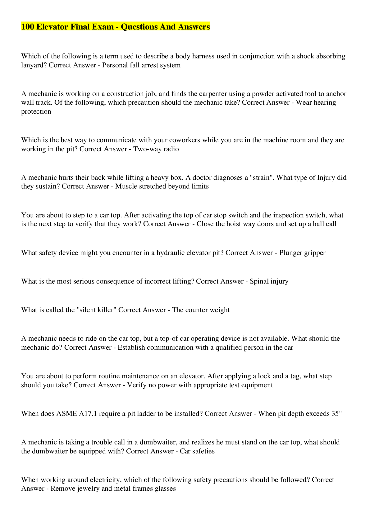 Electrical Engineering > EXAM > 100 Elevator Final Exam - Questions And Answers (All)