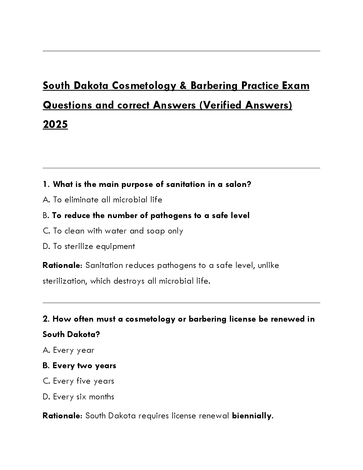 Barber > EXAM > South Dakota Cosmetology & Barbering Practice Exam Questions and correct Answers (Verified Answers) 2025 (All)