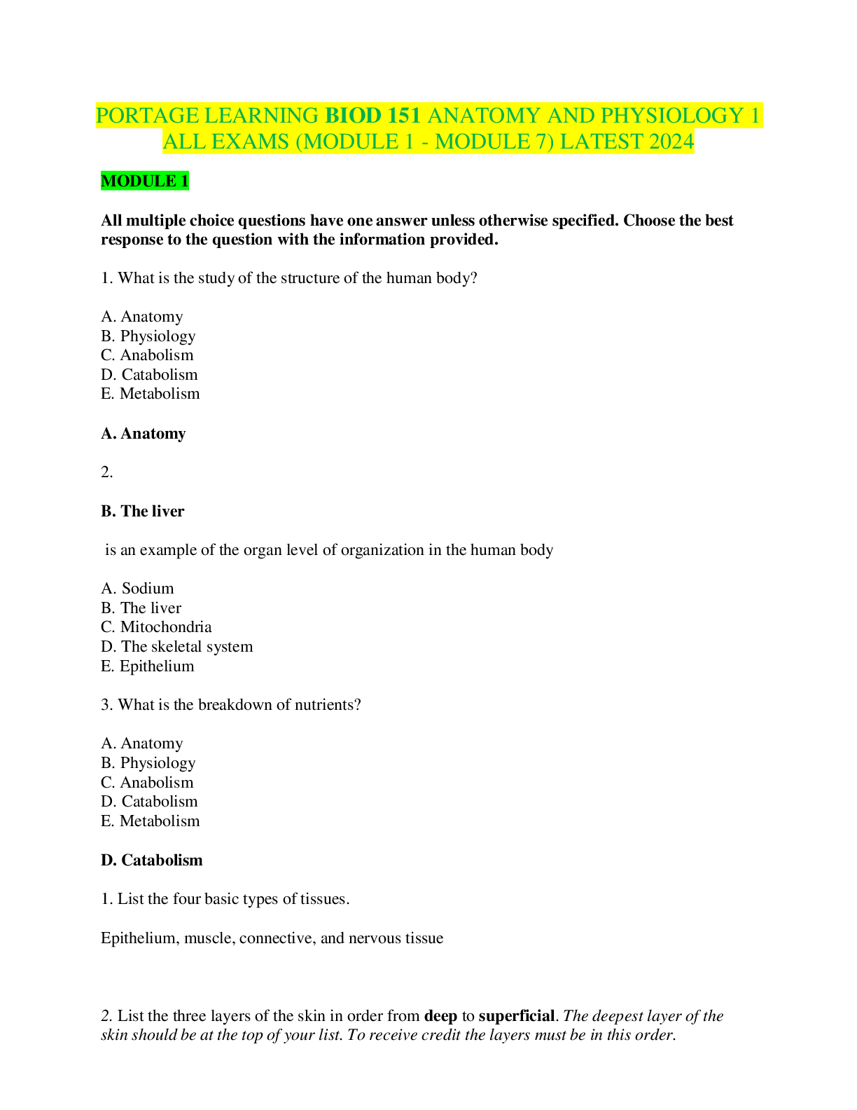 BIOD 121 > EXAM > PORTAGE LEARNING BIOD 151 ANATOMY AND PHYSIOLOGY 1 ALL EXAMS (MODULE 1 - MODULE 7) LATEST A+ (All)
