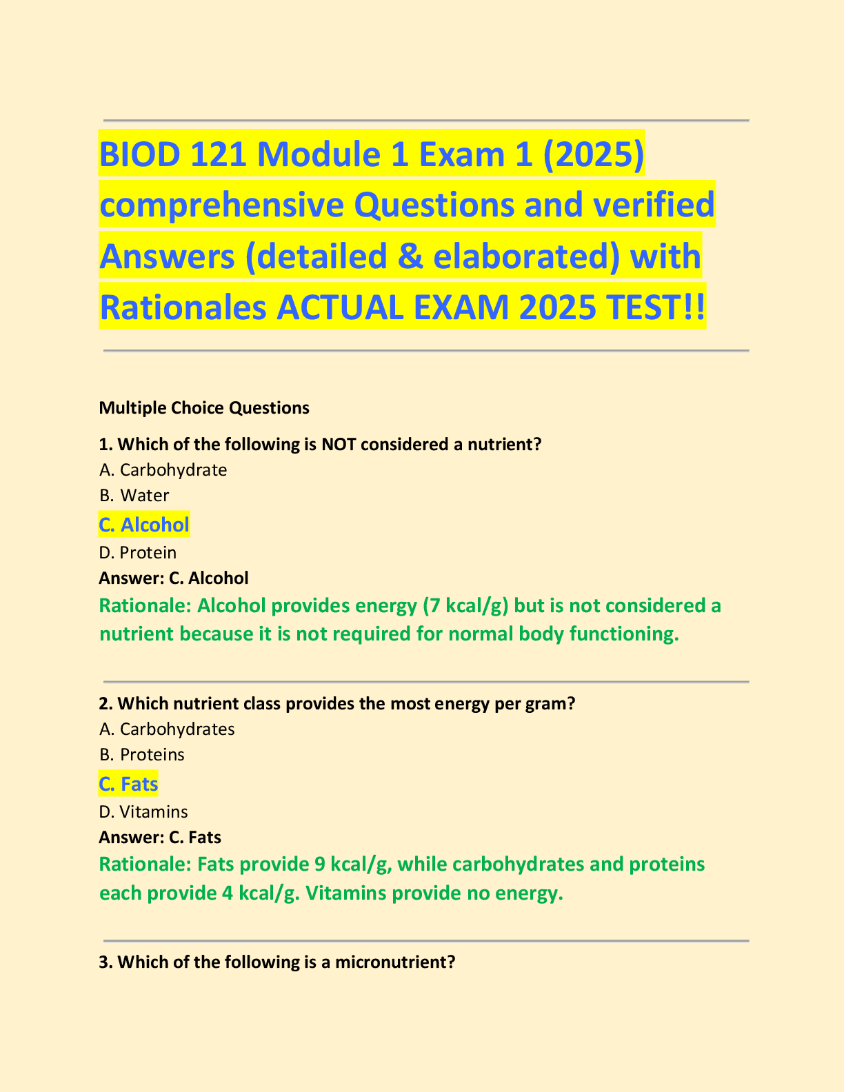BIOD 121 > EXAM > BIOD 121 Module 1 Exam 1 (2025) comprehensive Questions and verified Answers (detailed & elaborated) with Rationales ACTUAL EXAM 2025 TEST!! (All)