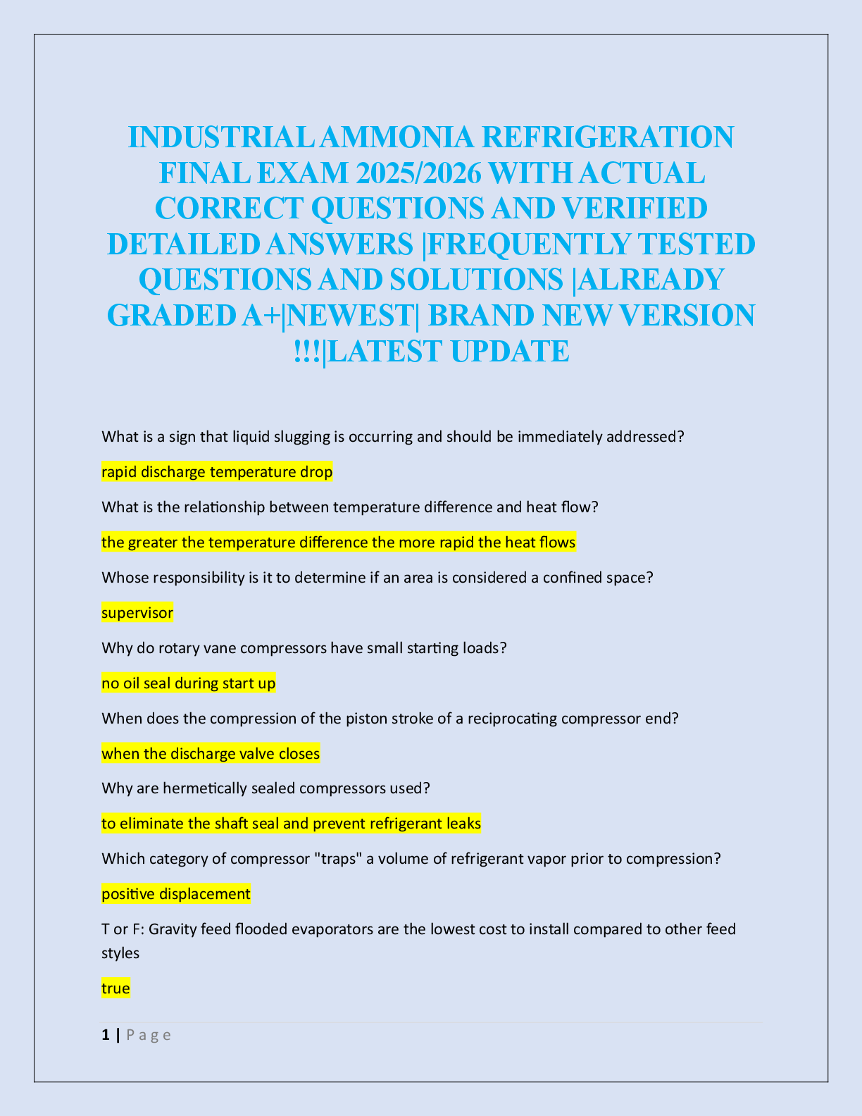 Industrial Chemistry > EXAM > INDUSTRIAL AMMONIA REFRIGERATION FINAL EXAM (All)