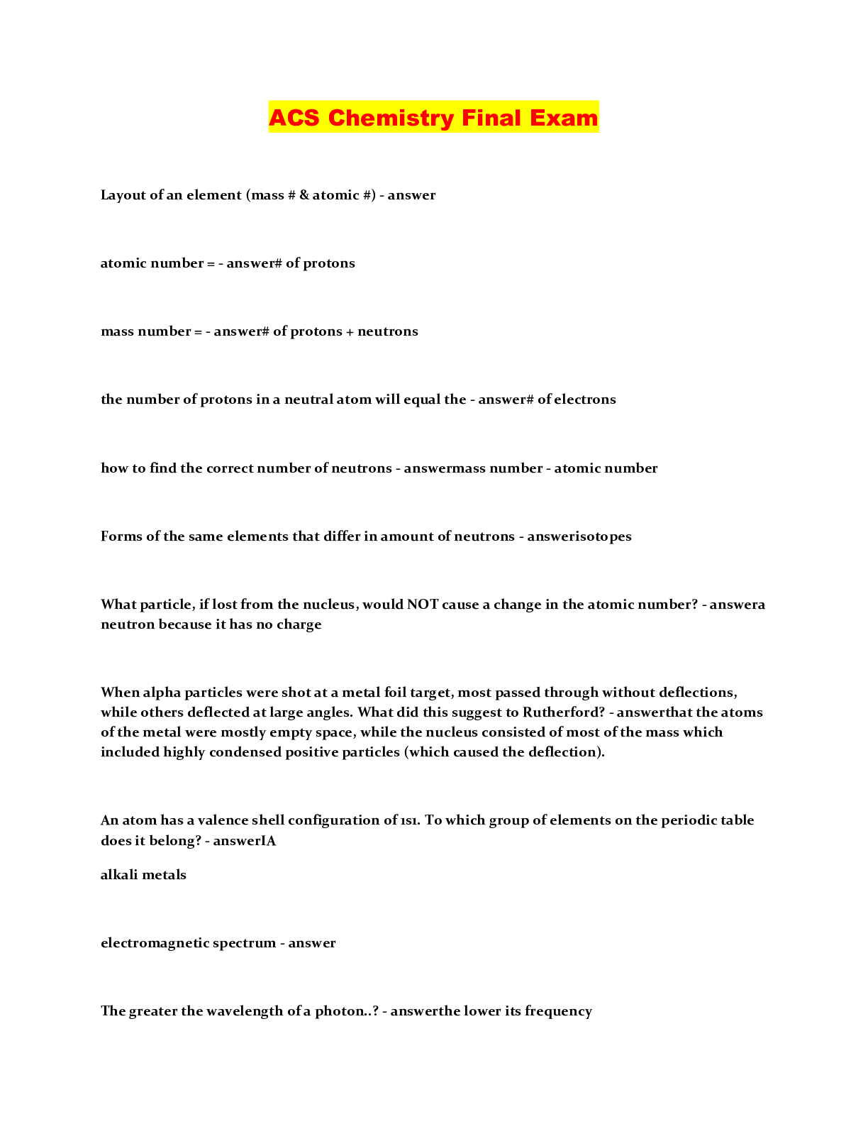 Industrial Chemistry > QUESTIONS & ANSWERS > ACS Chemistry Final Exam (All)