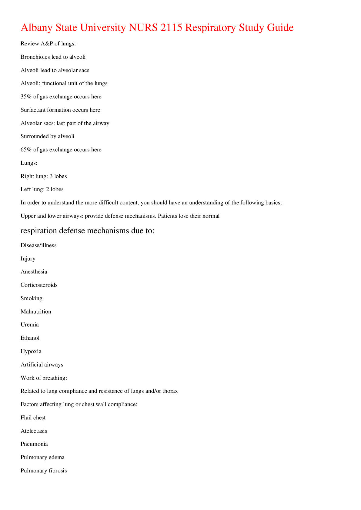 NURSING. > EXAM > Albany State University NURS 2115 Respiratory Study Guide,100% CORRECT (All)