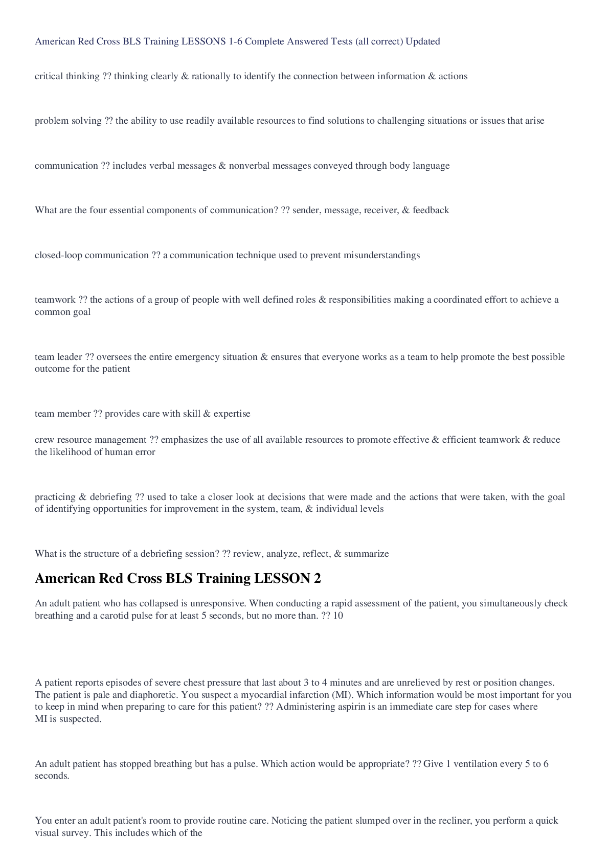NURSING. > EXAM > American Red Cross BLS Training LESSONS 1-6 Complete Answered Tests (all correct) Updated Spring 2023. (All)