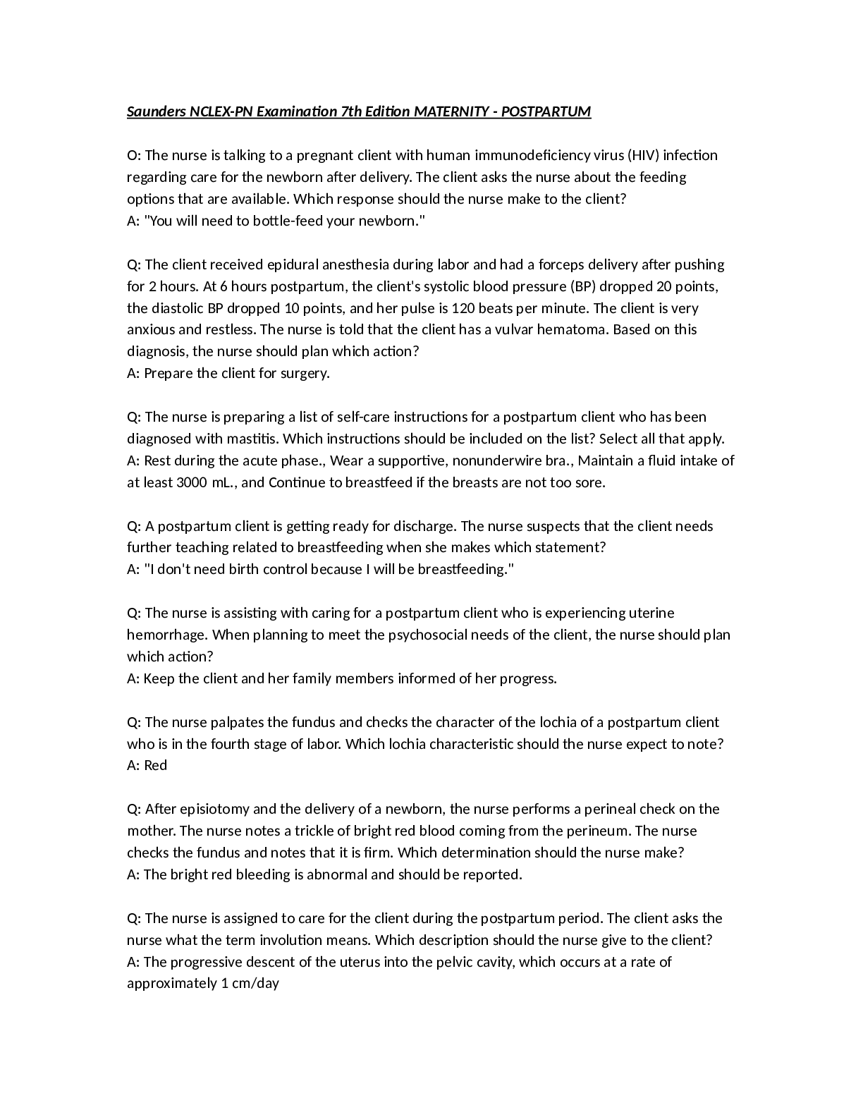 *NURSING > NCLEX > Saunders NCLEX-PN Examination 7th Edition MATERNITY - POSTPARTUM (All)