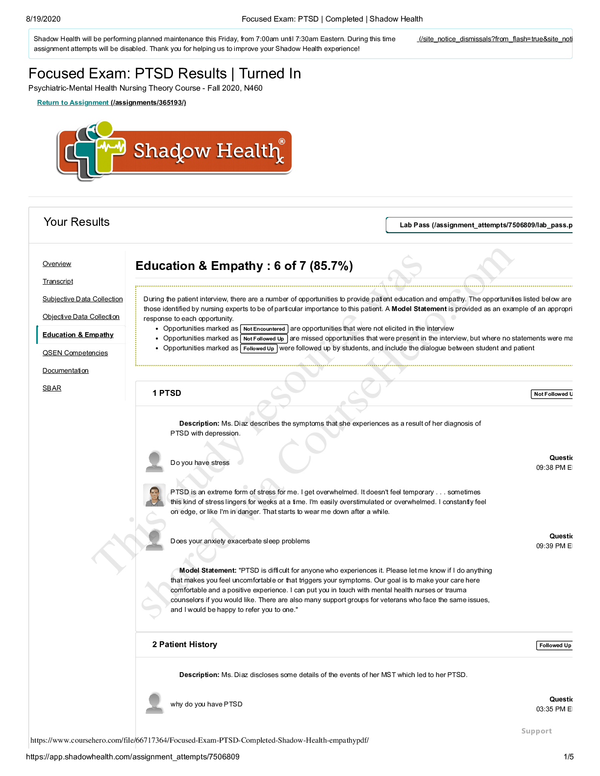 *NURSING > STUDY GUIDE > Focused Exam PTSD Completed Shadow Health empathy (All)
