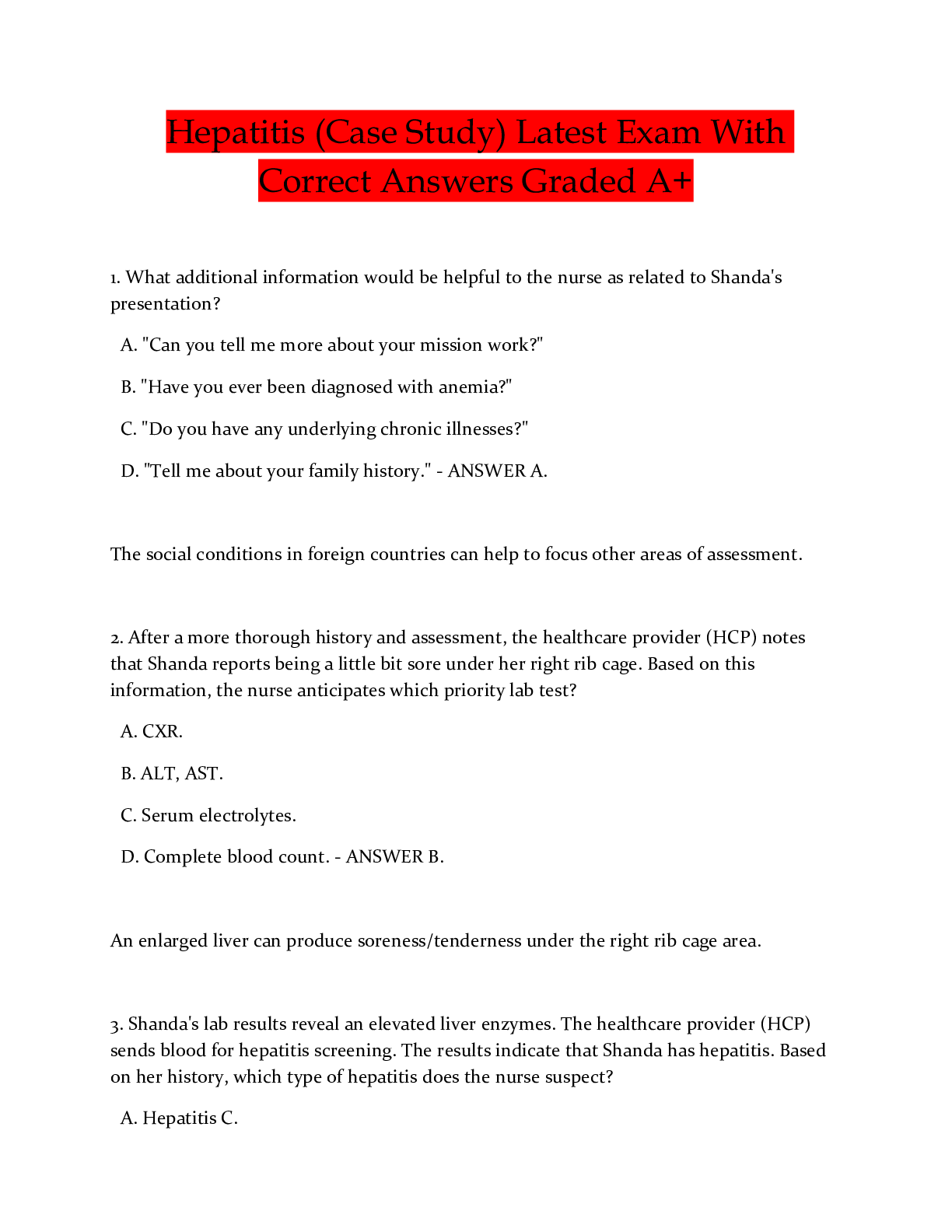*NURSING > QUESTIONS & ANSWERS > Hepatitis (Case Study) Latest Exam With Correct Answers Graded A+ (All)