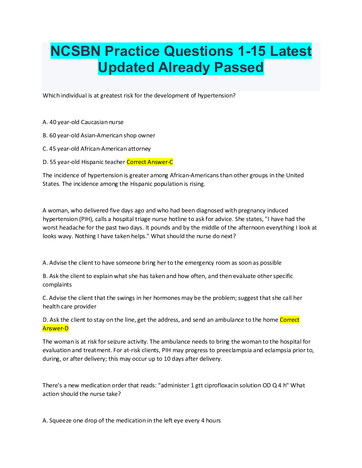 *NURSING > QUESTIONS & ANSWERS > NCSBN Practice Questions 1-15. All Questions with Rationales. Graded A (All)