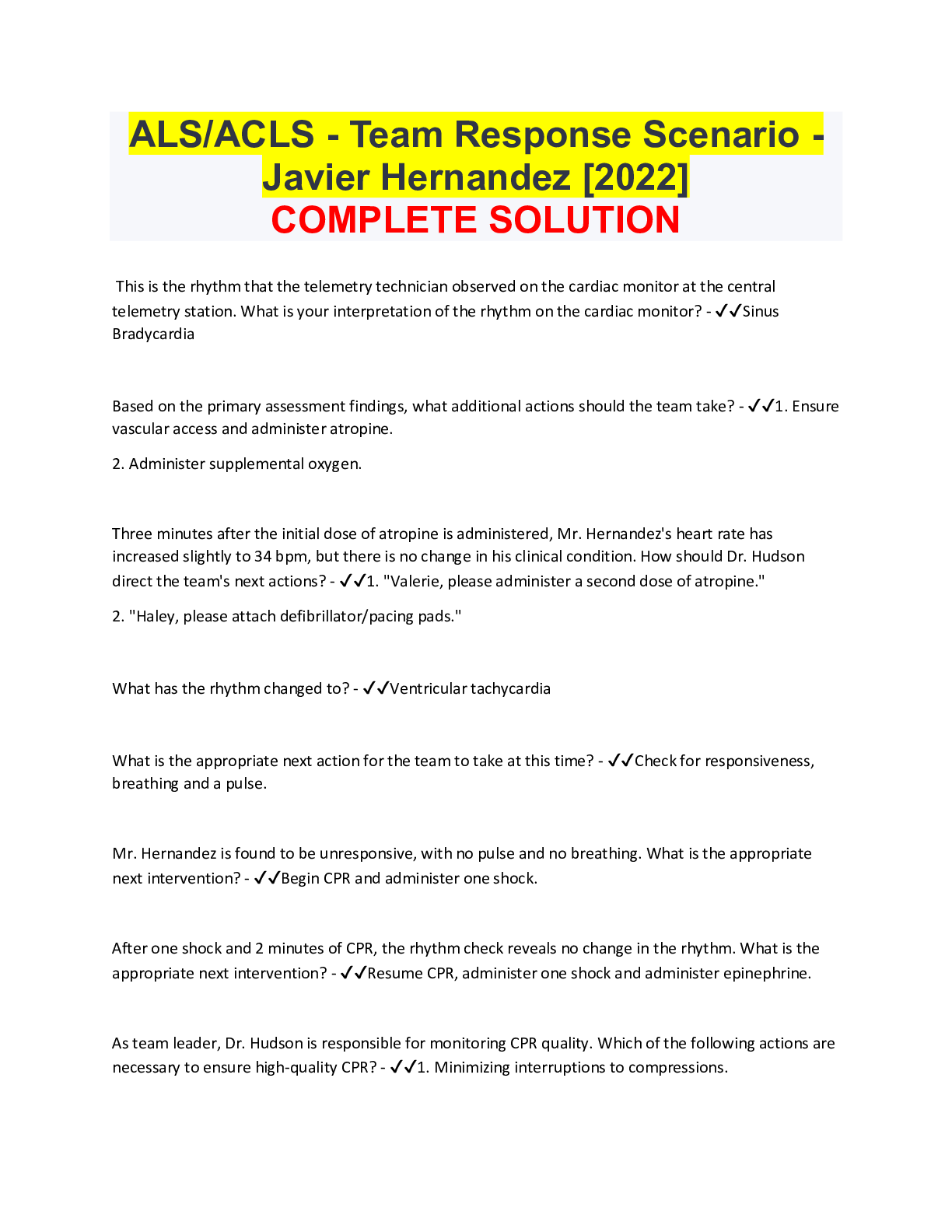 *NURSING > EXAM > ALS/ACLS - Team Response Scenario - Javier Hernandez [2022] COMPLETE SOLUTION (All)
