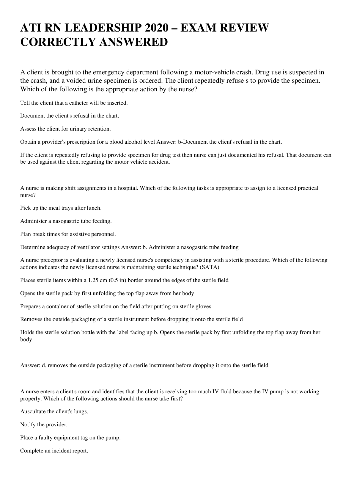 *NURSING > ATI > ATI RN LEADERSHIP 2020 – EXAM REVIEW CORRECTLY ANSWERED (All)